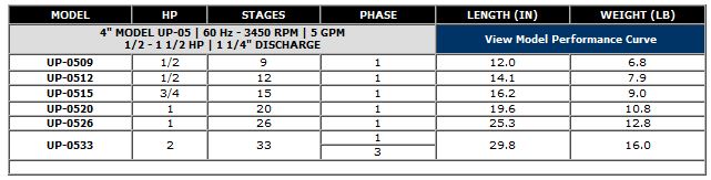 UP Series Submersible Pumps are manufactured using high quality materials and are designed to deliver years of dependable service. The UP Series is comprised of a large selection of pump models ranging from 1/2 HP through 10 HP with a broad variety of capacities (5 gpm - 80 gpm).Pumps are equipped with floating impellers to reduce the high starting torque. Impellers are made of abrasion resistant Noryl*, with polycarbonate diffusers. Both are encased in a stainless steel bowl. All materials used are highly resistant to corrosion and abrasion.