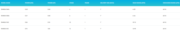 Head Range: Up To 95 Metres. Flow Rate: Up To 60 LPM. Delivery Size: 1``. Power Rating: 0.30 - 0.75 kW (0.40 HP To 1.00 HP) (1 Phase). Voltage Range: 180 V - 250 V (1 Phase).