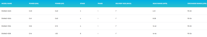 Head Range: Up To 56 Metres. Flow Rate: Up To 90 LPM. Delivery Size: 1``. Power Rating: 0.30 - 0.75 kW (0.40 HP To 1.00 HP) (1 Phase). Voltage Range: 180 V - 250 V (1 Phase).