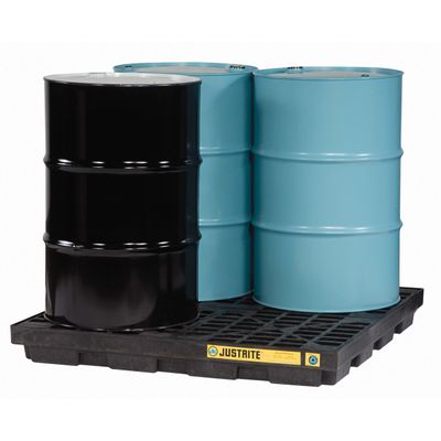 Justrite EcoPolyBlend™ 4 Drum Black Accumulation Center 28657 - Modular, Eco-Friendly Recycled Platforms Can Be Customized To Meet Your Workspace. EcoPolyBlend Accumulation Centers offer high value secondary containment and are environmentally friendly - made of recycled, durable polyethylene. Dirt hiding black color is 100% recycled; high visibility yellow is 35% recycled content. These Handy platforms offer leak protection from drums, pails, batteries, or any other container of hazardous or non-hazardous liquids. Sturdy, removable grates make sump cleaning easy while low profile offers convenience when loading/unloading. Versatile modular design allows you to customize your workspace - around existing structures, linear style, or over entire floor. Optional Joining Clips and Sump-to-Sump Drain Kit provide a continuous sump for on site compliance when needed. Accessory Ramp can be located anywhere on any units that are 2-drum or larger.