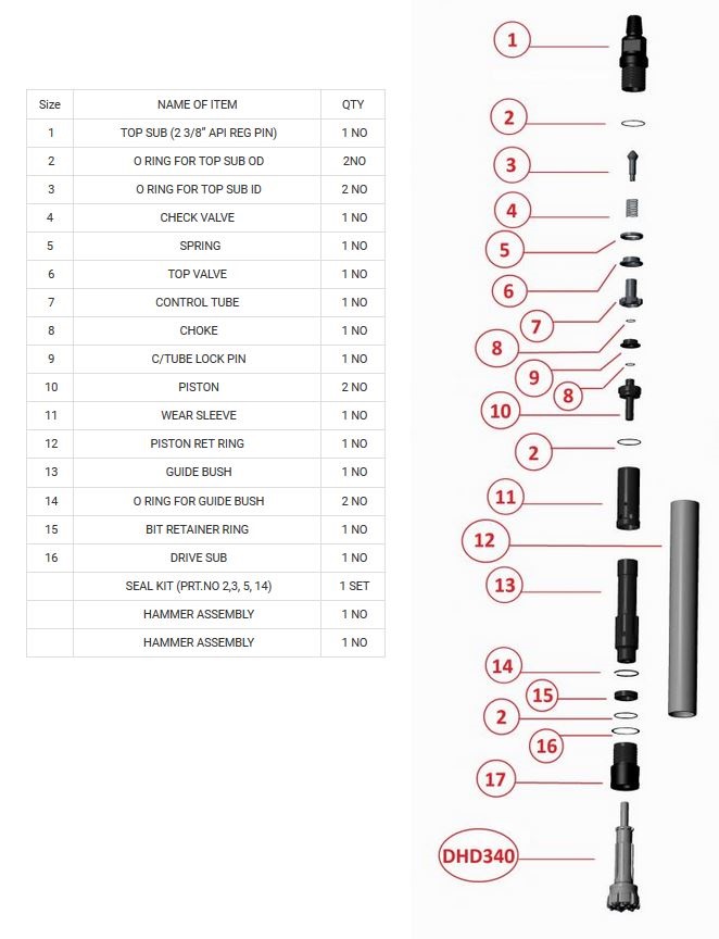 4” DTH Hammer, with Top connection Threads 2 3/8” API – IF PIN, Shank Type – Lotus FF 4 / Mach 44. SUITABLE BUTTON BITS : Flat face(Optional – Concave Face). Dia – 4” ( 102 mm) , Dia – 4 ½” ( 115 mm). Dia – 5” ( 127 mm), Dia – 6” ( 152 mm). Dia – 6 ½” ( 165 mm).