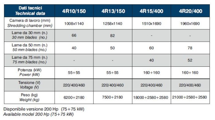 Technical data: 4R10/150. Shredding chamber (mm): 1008x1140. 30 mm blades (no.): 66. 50 mm blades (no.): 40. 75 mm blades (no.): -. Power (kW): 55 + 55. Voltage (V): 220/400/460. Weight (kg): 6200 + 2180.