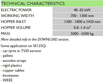 SE125Q is the smallest 4-shaft shredder manufactured by WRS Italia. Its special patented version TS50 can easily shred car tyres and reduce them into a fraction 0-20mm, steel free >98%. This machine represents the `heart` of the equivalent Tyres G recycling plant. Drive is done by 4 motors. A selecting screen with different measures and shape completes the machine outfit.