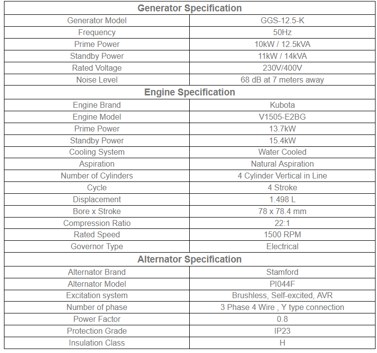 Introducing our Four Stroke Silent Type Diesel Generator, delivering a prime power output of 10kW (12.5kVA). This generator is powered by a reliable 4-cylinder Kubota engine and features water cooling for optimal performance. Trust in our generator for quiet and efficient power generation in various applications.