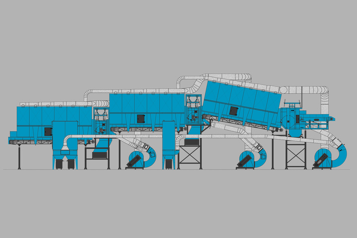 The three fan separators are executed with two regulation valves. These valves determine the amount of air to the blow mouth and the amount of air which must be discharged to the dust filter. We advise to supply the fan separators with frequency regulators, so the airspeed can be adjusted. By using these possibilities and the adjustments on the speed-up conveyor of the drumseparator and adjustment possibilities on the second drumseparator, the 4-way separator can easily be adjusted for different input flows and fraction sizes. The special fan separators allow the installation to work with a relatively small dust filter, due to the circulation of ± 80% of the total air capacity.