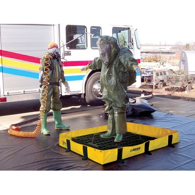Lightweight and folds down for easy storage and reuse to capture overfill spills from fuel tanks and refueling operations, hydraulic leaks and breaks, damaged saddle tanks, and leaky batteries. Use with optional grates as a decon station—short 8-in (293-mm) height for easy step-over.