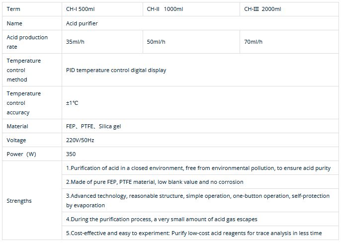 Acid purifier is the use of thermal radiation principle, keep the liquid temperature below the boiling point temperature evaporation, and then the acid vapor condensation to prepare high purity water and high purity reagents, widely used in AAS, ICP-OES, ICP-MS, AFS and other spectroscopy analysis.