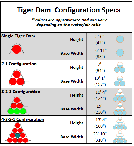 Filled Size: 42" x 50 ft. Fold Lengths, Sleeve Length: 8` Folds, 16` Sleeves. Rolled-up/Storage Dimensions (including 2 sleeves): 14" x 92". Single Dry weight: 302 lbs. Single Filled Weight: 56,000 lbs. Fill Time using Standard Fire. Hydrant: 50 min. How many Gallons in each Dam: 7,200 gal. How many sandbags each replaces: 15,000.