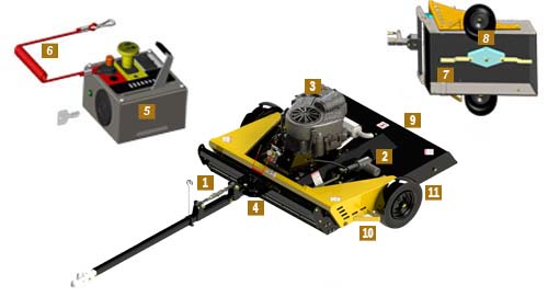 the only rough trail cutter which is completely controlled from the driver’s seat! unique in its category that is already equipped with an electric starter and cutting height. 100% fingertip controls (control box is included). start the engine (20 hp briggs & stratton). raise and lower the unit. engage it. emergency kill switch. throttle arm. 100% safe. equipped with an electric clutch to engage and stop the blades instantly. emergency lanyard kill switch attached to operator and control box, will stop the motor instantly in case the operator leaves the vehicle .. installation. universal on all vehicles equipped with a 2″ rear ball hitch. Equipped with heavy duty blades which will go threw schrubs and small twigs with ease.