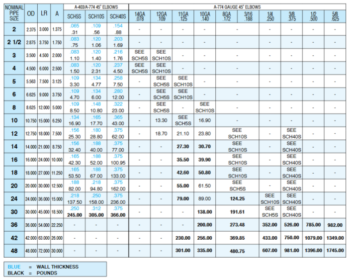 Manufactured in accordance to ASTM A-774 and A-403 specifications. Sizes larger than 48` are available upon request. Elbows shown in bold number are (3) pc mitered construction. OD and wall thickness are given in inches.