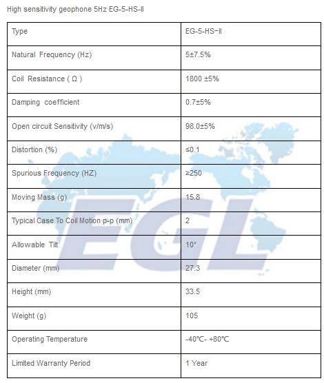 EGL - Model 5Hz EG-5-HS-I -4.5Hz , 5Hz High Sensitivity Geophone
