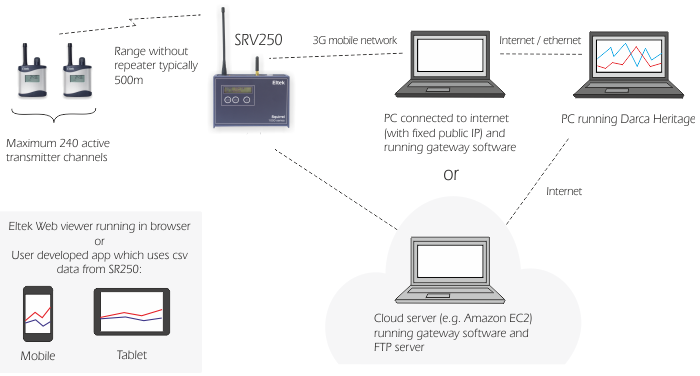 The Eltek Gateway program runs on a host computer under Windows at a fixed public IP. It receives the data pushed by the SRV250 and stores it in a file at a location accessible by the host computer. The file format is selectable as Windows CSV or Eltek DAT. The Gateway is designed to collect data from any number of SRV250 receiver loggers, each giving rise to its own data file. The SRV250 only communicates with the remote Gateway when it has data to send.