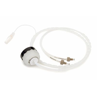 Kalrez sealed bottle cap assembly lasts years in the harshest environments. Each assembly uses 10 μm particle filters, Teflon inserts, and PTFE tubing. Variable sizing available.