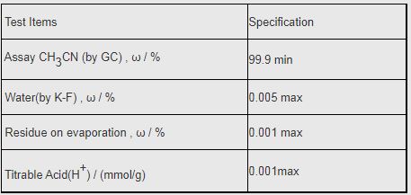 4L Anhydrous Acetonitrile; CAS.No: 75-05-8 Molecular formula: ChUCN. Molecular weight: 41.05.. Density(20): 0.783g/ml.. Quality indicators: main content:>99.9%. Test Items Specification Appearance Colorless transparent liquid Assay CH3CN (by GC),ω/% 99.9 min Color(APHA) 10 max Residue on evaporation ,ω/% 0.0005 max Water(by K-F),ppm 10 max Titrable Acid(H+),b/(mmol/g) 0.0005 max