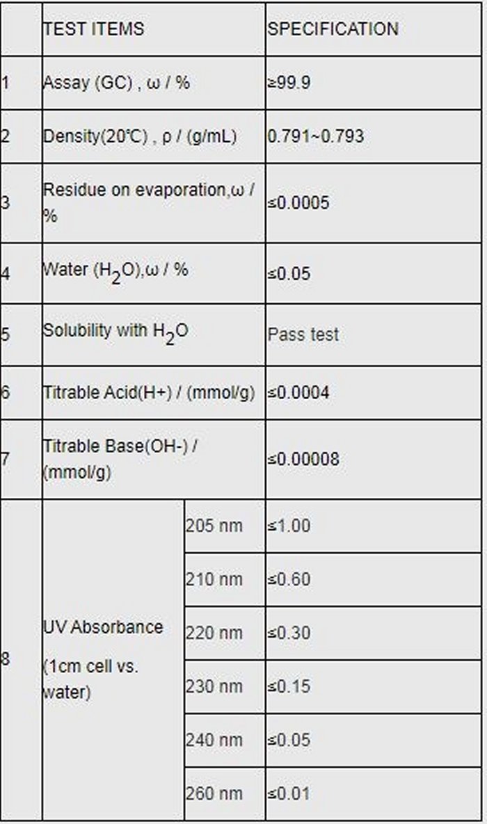 4LHPLC Grade Methanol. CAS.No: 67-56-1 Molecular formula: CH3OH. Molecular weight: 32.04. Density(20): 0.792g/ml. Refractive Index: 1.3288.