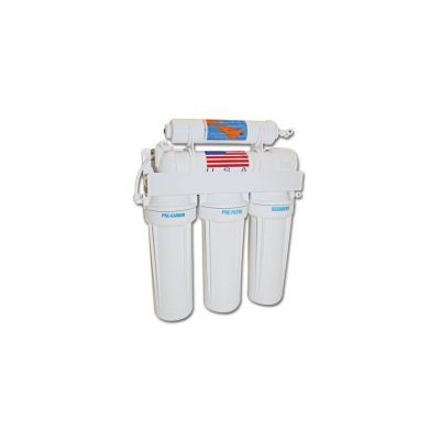 5-stage reverse osmosis (RO) water purification system with 50 GPD RO membrane, membrane, 1 - sediment and 2 - carbon block 1-sediment and 2-carbon pre-filters and post carbon filter. System comes complete with tubing, shutoff valve, long reach faucet, instructions, long reach faucet, tank, hardware, tank, instructions; 1-year limited warranty.