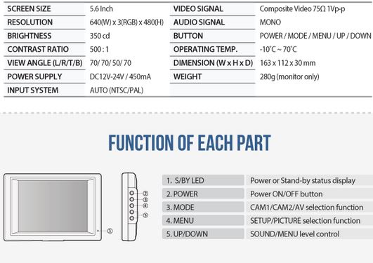 8bit MICRO controller. TFT LCD with high resolution and low reflection. All functions are displayed on screen (OSD function). PWM volume control. Mode selection function. Low energy consuming rate. Language Display Selection (KOR-JPN-GER-ENG-SPA-FRE-ITA). 1 Cable solution. Free voltage (From DC 12V to DC 24V). Dimmer selection function.