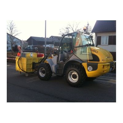 Container volume ca. 1-2 m³. Dimension LxWxH 2,0 x 1,3/1,5 x 2,0. Ventilators 22-/32-KW hydraulically powered single fan system. Filtration System Manual or optional automatic self-cleaning system with external air compressor. Suction hose carrier. Manual with hose support (Spring Balance). Suction hose D = 125/150mm. Chassis Simple adaptation to wheeled loaders, excavators or vehicles with suitable hydraulic take offs