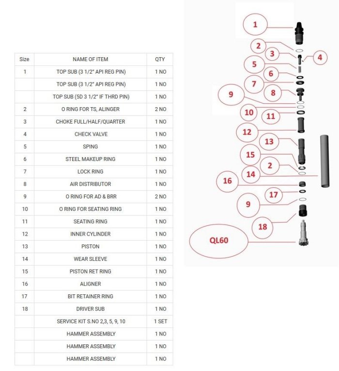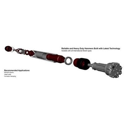 6” Valve-less DTH Hammer with Accessories, Top connection Threads 3 1/2” API REG PIN, Shank Type – QL 60 Hammer. SUITABLE BUTTON BITS : Flat face(Optional – Concave Face). Dia – 6” ( 152 mm) , Dia – 6 ½” ( 165 mm). Dia – 7” ( 152 mm), Dia – 7 ½” ( 165 mm). Dia – 8” ( 203 mm), Dia – 8 ½” ( 216 mm).