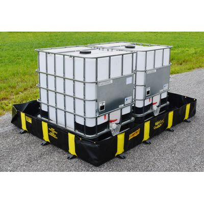 Safe, drive-in spill containment for drums, IBC totes, and tanks. Single-piece construction - patented Rigid-Lock wall support system integral to berm provides unobstructed work space. Quick and easy setup - NO ASSEMBLY REQUIRED. Durable modified PVC coated fabric withstands long term UV exposure - great for outdoor use. The Rigid-Lock QuickBerms ergonomic design provides 100% inside berm accessibility with an unobstructed side-to-side floor space for vehicle tires, foot traffic, and cleaning. The patented Rigid-Lock wall-support design protects personnel against trips and falls when walking along the outside perimeter. Built-in stainless steel wall supports lock the sidewalls in a 12-in (305-mm) high, 90° vertical position. The Rigid-Lock QuickBerm® offers immediate, secure deployment and no-worry, spill-readiness.