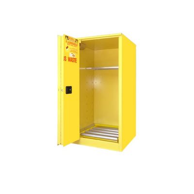 Self-Close, Self-Latch Sliding Door. Dim: 65`H x 34`W x 34`D. Approx. 400 Lbs. Ship Weight. No. of Shelves: 1 . The safe way to collect and store Flammable Hazardous Waste is with SECURALL® Hazardous Waste Drum Cabinets. Cabinets are equipped with a shelf to hold 5 gallon containers. The Resource Conservation and Recovery Act (RCRA) has made it mandatory that hazardous waste be collected and disposed of properly. SECURALL® offers the largest capacity drum storage cabinets in the industry. All Hazardous/Environmental Waste Drum Cabinets are equipped with Roller Bottoms for easy loading of heavy drums.