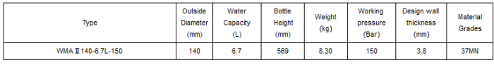 - 6.7 litre; Iso9809-3 or GB/T5099.3 standard; 37 mn manganese steel; 140mm cylinder outer diameter; Hydrostatic test pressure is 250bar; Working pressure is 150bar;