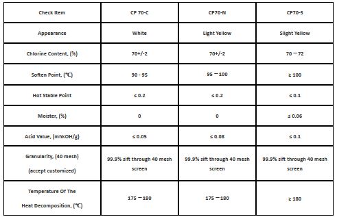 CP70-S is recommended for flame retardant cable and rubber, as extrusion anti-wear additive for Iubricant, metalworking oil. and ps, pe, pvc, masterbatch. CP70-S has higher soften point and temperature of the heat decomposition, it is more stable while the end product suffered fire.