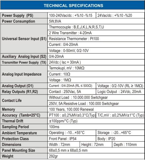 2X4 Digit Numeric Display. 2 Led Indicator. Transmitter Power Supply Output (24Vdc) Universal Sensor Input (TC, RT, mA, mV, V) Auxiliary Analog Input (0/4-20mA). 3 Digital Input. RS485 Communication Unit Analog Output (0/4-20mA, 0/2-10V). 2 Relay or Logic Output (24Vdc) 100-240Vac Universal or 24Vac/dc Power Supply Isolated Between Input/Output Modules. Non-Feedback Rational Valve Control (Floating Control). PID Heating/Cooling. Auto-Tuning (PID parameters automatic adjust). Automatic/Manual Working Modes. Bumpless Transfer Ability. Sensor Error Detection. Remote Control Set Ability. 8 Optional Set Point. Ramp Function. Retransmission (for Process and Set Value). 15 Different Relay Functions. ON/OFF, P, PI, PD, PID Control. Linear and Time Proportional Control Output. 100ms Sampling and Control Period. Standard MODBUS RTU Communication Protocol. 3 Years Warranty for Manufacturing Errors.