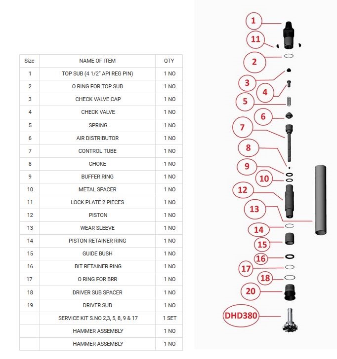 8” DTH Hammer, with Top connection Threads 4 1/2” API REG PIN, Shank Type – DHD 380 Hammer. SUITABLE BUTTON BITS : Flat face(Optional – Concave Face). Dia – 8” ( 203 mm)*, Dia – 8 ½” ( 216 mm). Dia – 9” ( 229 mm)*, Dia – 10” ( 254 mm). Dia – 10 ½” ( 280 mm).