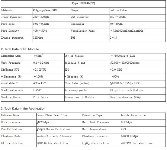 Product Item:UF8040(PP). Pore Size:0.02~0.2μm. Effluent NTU≤0.10NTU. Pore Density: 40%~50%. Cutoff Dalton:50K-80K .