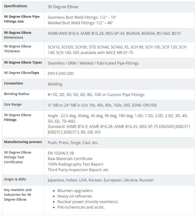 Elbows are a type of fastening device that could be used to change the direction of flow between two pipes in a system. Generally, elbows are available with an angle of 22.5, 45 and 90 Degree. A 90 degree elbow dimensions are used in those instances, where the direction of the flow of media is to be altered to a course of 90 degrees. The 90 degree pipe elbow dimensions is a part of the ASME B16.9 used to construct a 90 degree elbow, which also takes into account the grade of material used, size, tolerance, markings etc.