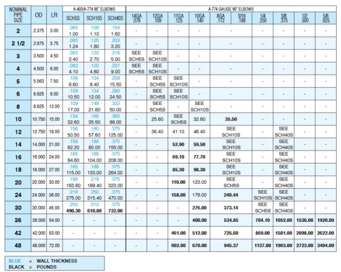 Manufactured in accordance to ASTM A-774 and, A-403 specifications. Sizes larger than 36` are available upon request. Elbows shown in bold number are mitered construction. OD and wall thickness are given in inches.