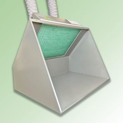 The particulate (intake) filter is a three stage graduated fibre filter with a high ‘dust’ holding capacity for long life. Filtration to 5 micron particles. NB: Spray particulate sizes vary from 10 to 20 microns. The dual process of filtration and then extraction to atmosphere via our flexi-duct system, vastly reduces and/or eliminates operator exposures to potentially hazardous substances.
