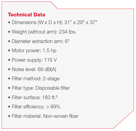 The Weld Fume Extractor is a robust filter unit and offers many advantages for frequent use at changing work stations. Equipped with IFA-W3 certified two-stage filtering with increased filter surface and HEPA rated primary filter. The unique “Stay-in-Place” Exhaust Arm swivels 360° to give welders an unmatched freedom of movement with very little effort. The durable steel housing is powder coated and hermetically sealed to ensure no air leaks. In addition, an included filter monitor increases safety for welders and all other personnel. Suitable for welding applications including stainless steel and high chromium content.
