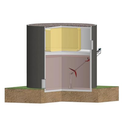 The foil gas storage is hung up in the central dome of the roof and connected gas-tight to the tank wall. Through the gas produced in the digester the inner membrane will be blown up. The gas is stored pressureless in the foil gas storage.