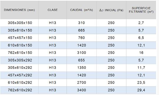 Very high efficiency absolute filter constructed with fireproof and water-repellent fiberglass paper in a mini-fold system with constant package width and deep fold, with a wooden or galvanized steel frame sealed with polyurethane resin and continuous elastomer gasket. Overall MPPS efficiency: 99.95%. Recommended final Δp: 600 Pa. Temperature: 80º C. Relative humidity: 100%. EN 1822 class: H13.