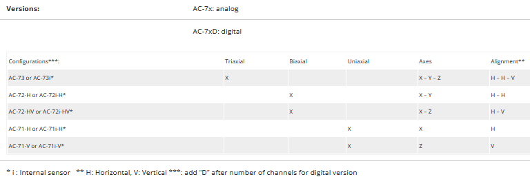 - Specify: Version and configuration of AC-7x, full scale range, and other applicable options