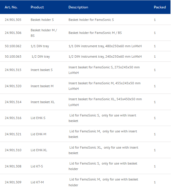 In order to make sure that the ultrasonic cleaning bath works properly, it is necessary to use it in combination with a basket and lid. For the FamoSonic S, M and XL there is an insert basket available. Alternatively, it is possible to use 1/1 DIN or ISO and 1/2 DIN trays. A tray must never be placed directly onto the bottom of the ultrasonic cleaner, because this might damage the unit. Therefore, Famos offers basket holders which the instrument trays can be placed on.