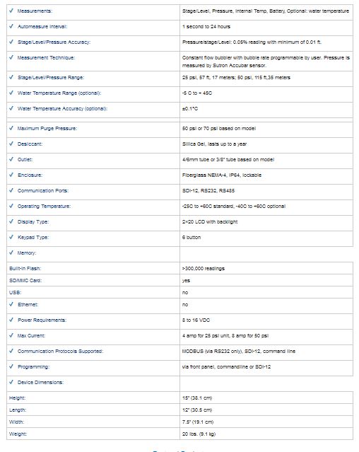 The Accubar Constant Flow (CF) Bubble Gage is a self-contained, precision device to measure water levels & water temperature, consisting of a pump, tank, manifold, control board, display/keypad & enclosure. The CF Bubbler’s built-in precision Accubar® Pressure Sensor meets the high accuracy requirements for stream gaging & monitoring of tidal/coastal areas, estuaries, groundwater, & reservoirs. The Bubbler includes a built-in datalogger for stand-alone operation &/or backup (redundant) data recording and RS232 & SDI-12 ports for communications & maintenance. Also supports MODBUS.