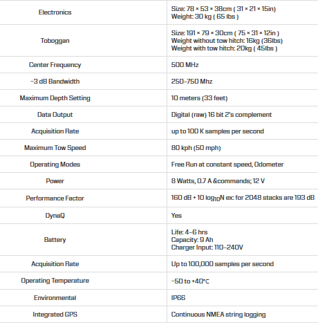 Rapid data acquisition enables the unit to be towed at speeds up to 80 km per hour. Low power requirements make it possible for a 12V battery to power the system.