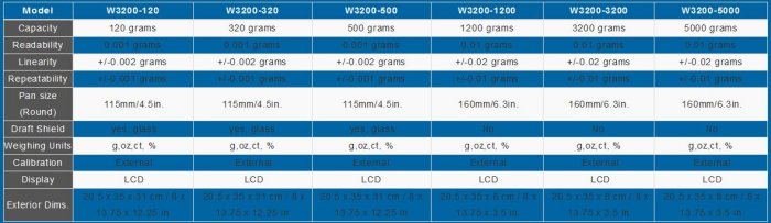 Six models are available in the Precision Balance range, covering a wide range of maximum capacity requirements. The smaller capacity models (120g, 320g, and 500g) include a glass draft shield with 3 sliding doors for easy access the weighing chamber. These models offer readability to .001g (1mg). The larger capacity models (1200g, 3200g, and 5000g) feature a more traditional top-loading design, come with larger weigh pans and have readability to 0.01g