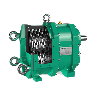 The Accuvon twin shaft multi-function grinder is a versatile cutting tool designed for high-efficiency solid particle fragmentation in fluid mediums. Built on the foundation of the Accuvon lobe pump design, this machine efficiently breaks and disperses solid fragments such as sludge, fibers, plastics, and more, ensuring smooth operation of downstream pumps or equipment. Its design features interchangeable parts with the Accuvon rotary lobe pump, with rotors replaced by shear blades for optimal cutting. The dual rotating shafts, driven by synchronized gears, perform precise cutting and prevent entangling of fibrous materials. The grinder's robust construction includes a quick-release cover, axial casing protection, customizable blade combinations, a hexagonal shaft bushing, and durable gearing housed in a sealed chamber. Suitable for various applications, the grinder operates with low energy consumption and minimal maintenance costs. Optional accessories include different blade materials and a control system that prolongs blade life and resolves blockages.