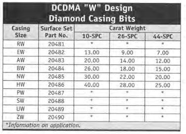 A casing bit is usually set with diamonds and used to rotate the casing into solid materials where it can be withdrawn without the hole caving in for the purpose of cementing other casing into place. The diamond casing bit has both inside and outside diamonds to facilitate making a hole with clearance as well as using the casing as a drill tube.