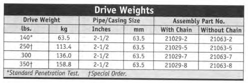 Light duty (140 lb.) drive weights are primarily used for "Standard Penetration Tests" with drive type samplers. Heavier drive weights are used to drive pipe, casing, chopping bits, boulder busters and heavy duty samplers. They are operated like a pile driver. Drive weights are available with or without a chain sling.