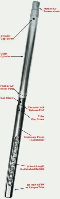 As the water or air pressure is applied to the drill rods at approximately 100 to 600 PSI, the piston in the head of the assembly forces the thin wall sample tube in the soft underlying soil or clay materials to take the sample.