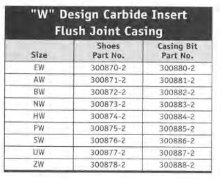 Available in all standard sizes for OCDMA "W" Design casing. The carbide insert is a very economical bit for spinning in casing through soft rock strata or where casing is left in the hole. More economical than diamonds, the carbides withstand shock loads when drilling overburden. Carbides may not be sharpened and are usually run to destruction. There is no salvage value.