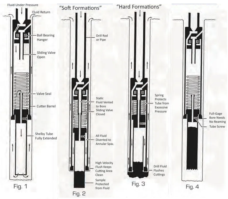 - No more crumpled shelby tube; no presetting, no surface control needed. Spring-seated tube telescopes into cutter barrel as formation hardness increased.