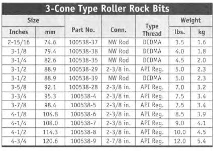 Conventional three cone design roller rock bits are widely used in soft to medium hard formations. This versatile bit is used in overburden and has been quite successful in drilling rock. However, it does require a considerable amount of down pressure to successfully cut rock. Roller rock bits are used with drilling muds or plain water. (Bits are available on special order for use with air os o flushing/cooling medium.) The bit is usually backed up by a heavy steel drill collar to provide the additional weight needed.