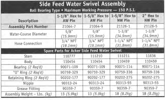 For use with drill rigs not having hollow spindles. Adapts direct to rotary stem or kelly. Water is fed into side part and down through drill rods. Used with auger drills for either high or low speed application, coring fish tailing, or small roller rock bits. Advise spindle connection, inlet port and rod size desired. Working pressure 150 PSI MAX. Ball Bearing type with 3/4" and 1-1/4" inlet ports.