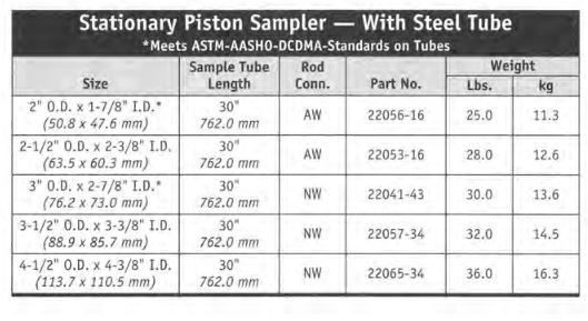 This sampler features a stationary piston, that is, the piston remains stationary as the outer tube of the sampler is pushed ahead into fine silts or clays. The piston creates suction on the sample assisting it into the sample tube. In operation, the piston closes the entrance of the tube eliminating any change of contamination in the tube prior to pressing. The sampler features a vacuum release and a cone clamp assembly that prevents the piston from pushing out the sample upon recovery. The outer tube, containing the sample, is generally used to carry the sample to the laboratory. Several replacement tubes and caps are desirable to take continuous samples without delay. The actuating rods are in convenient tengths for transportation and are necessary to hold piston during the pressing of the sample. For operation in brackish water, brass or stainless steel tubes are commonly used.